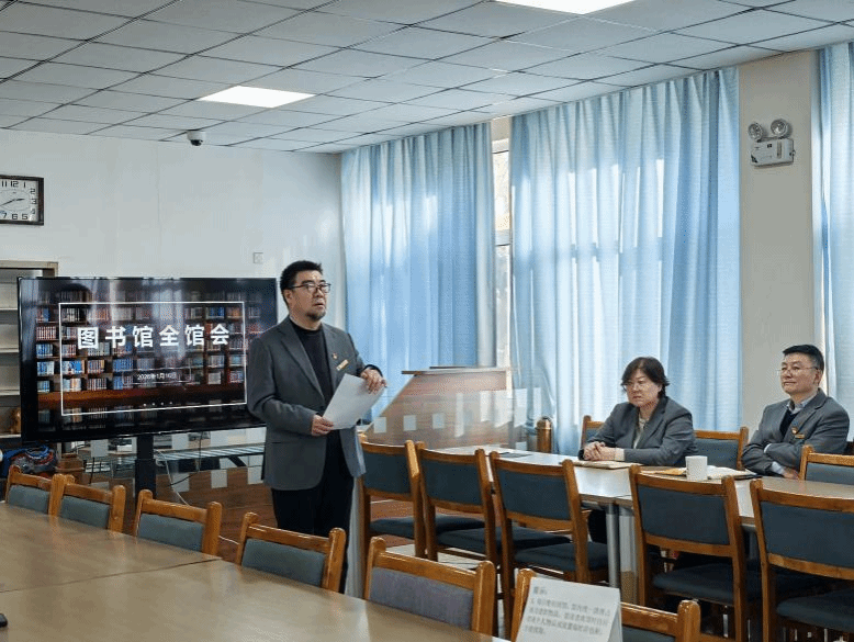 2026 年 1 月 16 日下午,图书馆召开全馆会,总结 2025 年工作,并部署假期相关工作,全馆人员参会。