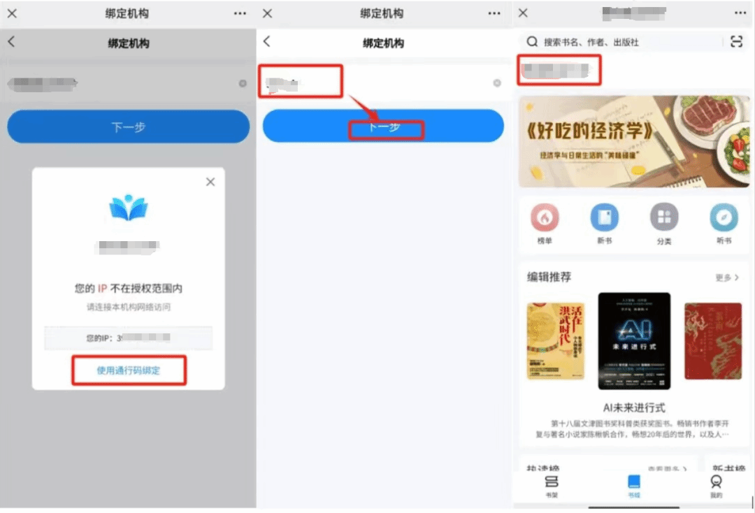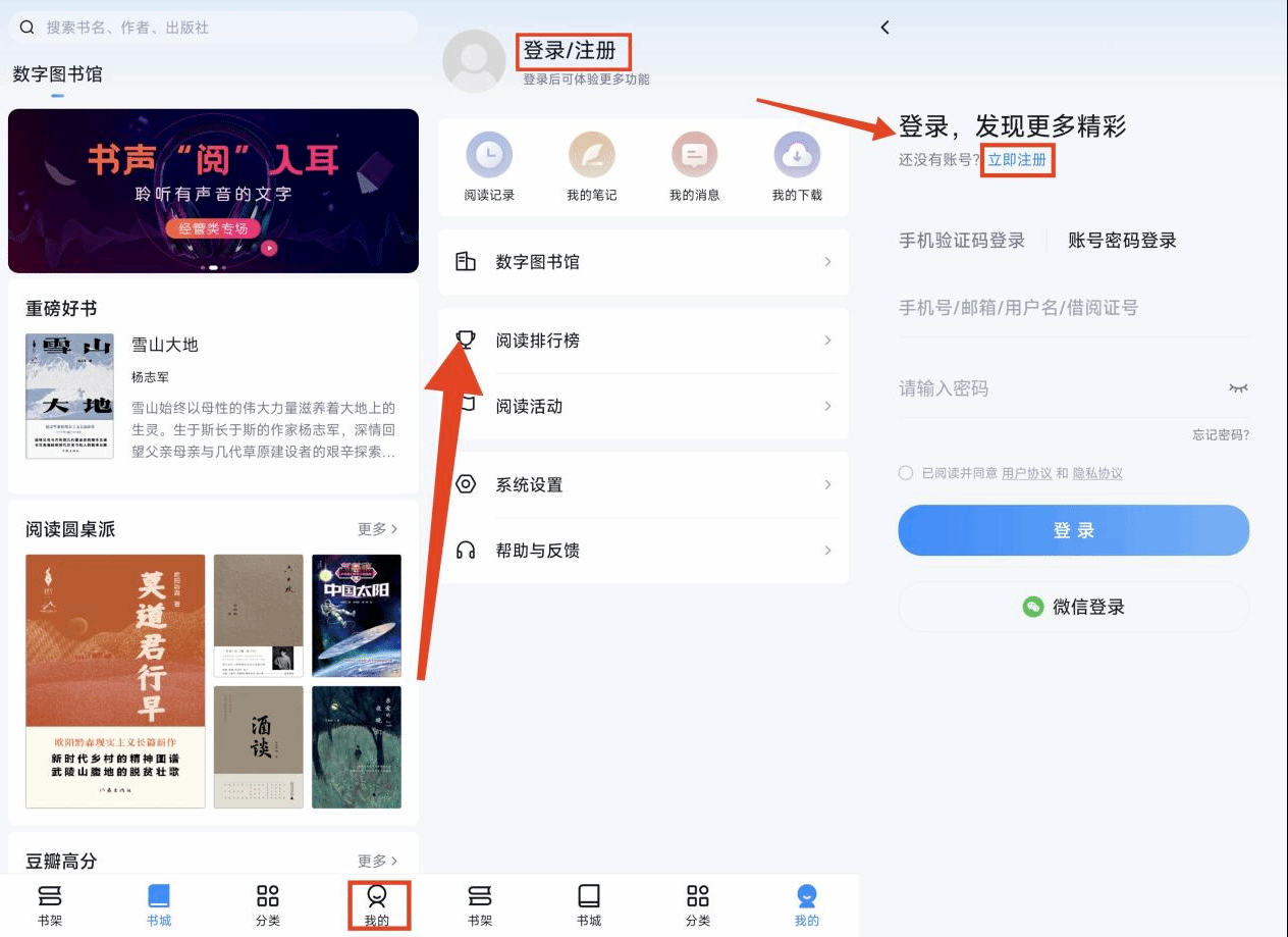 进入书城点击“我的”—“注册登录”,输入手机号注册即可。若提示“不在允许注册的范围内”,可选择“通行码绑定”,通行码为:t1g9dh