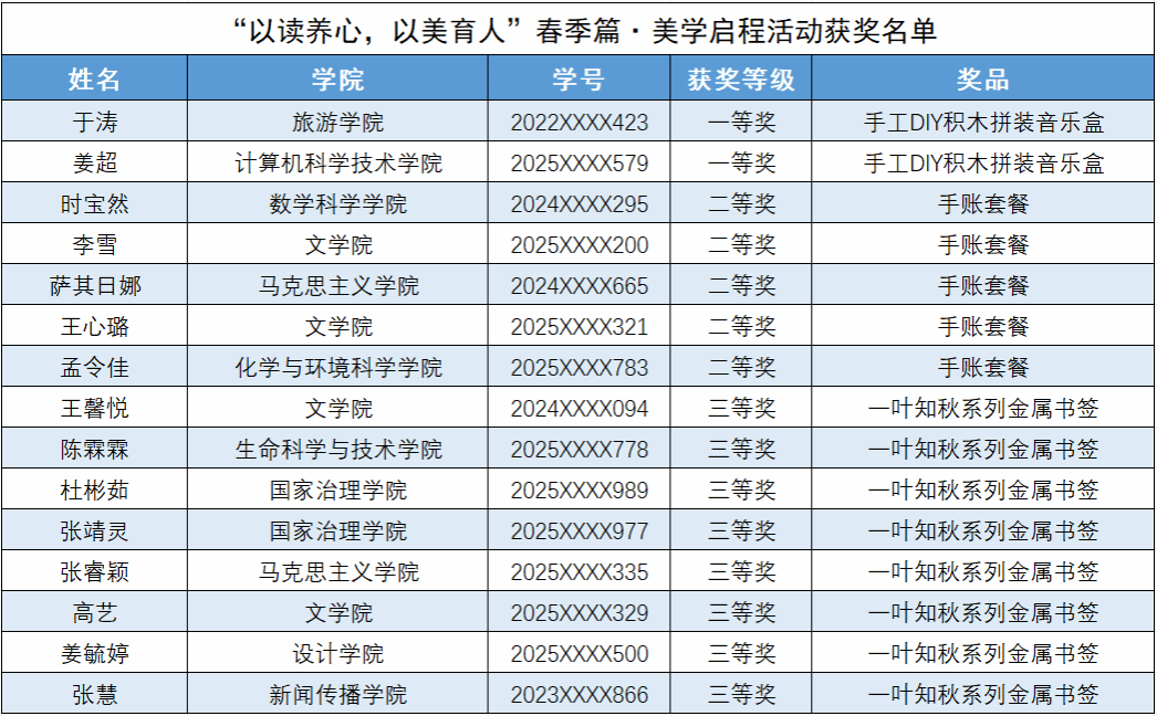 第一阶段活动中,读者通过阅读指定美学书籍、累计阅读时长及撰写读书随感进行综合评奖。最终,我校共有15名读者脱颖而出,具体获奖名单如下: