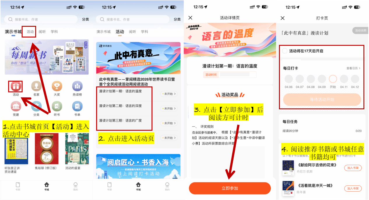 重要提示:漫读计划需点击【立即参加】按钮后方开始计时,阅读满20分钟记为一天。
